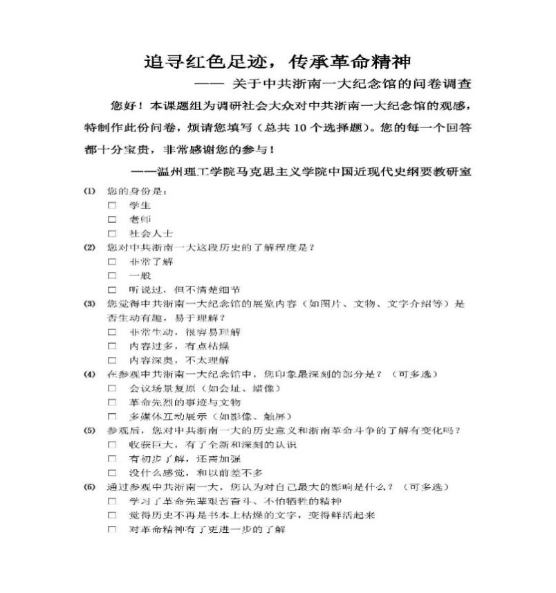 为了调研社会大众对中共浙南一大纪念馆的观感,我们还在老师的指导下提前制作了调查问卷《追寻红色足迹,传承革命精神——关于中共浙南一大纪念馆的问卷调查》。到达场馆后,我们就分发给本次参加实践的同学,以及其他来参观的游客填写。后续,我们还将在校内分发给在校师生填写。