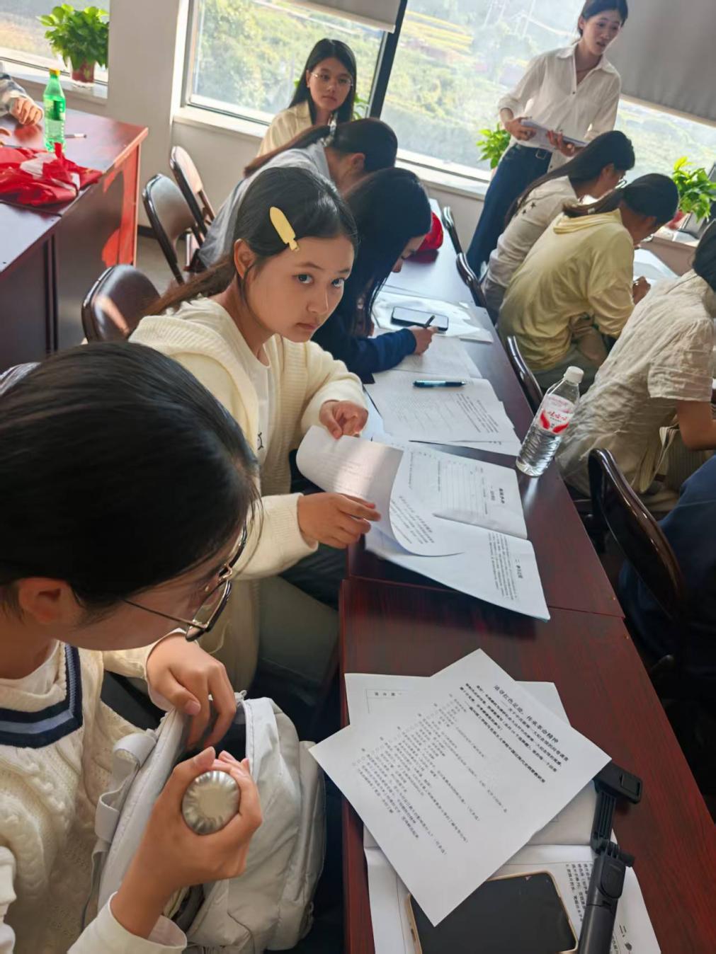 自由活动结束后,老师召集同学们再度相聚,展开现场研讨。牟老师在展厅内为同学们现场讲解相关党史知识,徐老师与同学们在会议室内共同研讨浙南红色革命精神。同学们积极发表自己的看法,踊跃填写问卷,在老师的指引下加深了对此次实践活动的体验与理解。