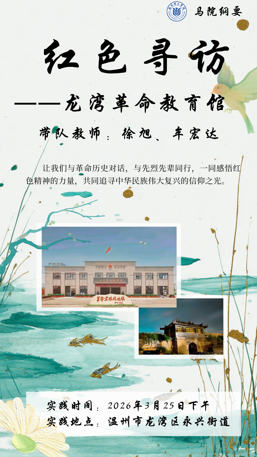 位于温州龙湾区永兴街道的龙湾革命教育馆——那承载着历史遗存的场所,在时间的长河中熠熠生辉,无时无刻不熏陶着广大人们的心灵。2026年3月25日,马克思主义学院的徐旭、牟宏达两位老师,带领着142名学生奔赴龙湾革命教育馆,开展红色寻访实践活动。今天,学子们跟随着带队教师的步伐绕过大山,经过一路坎坷,触碰历史记忆的脉搏,感受那时代长河里的红色基因。