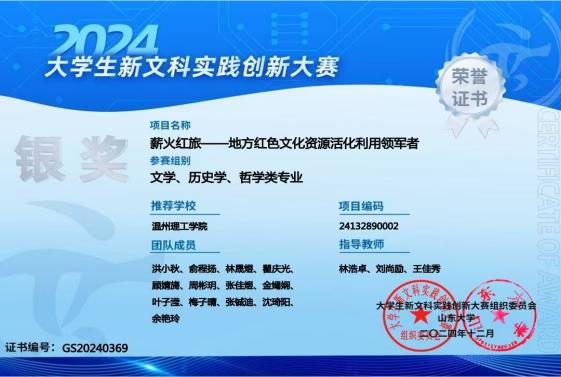 2024年12月21日,由山东大学主办的“浪潮杯”2024年大学生新文科实践创新大赛决赛现场赛在山东济南拉开帷幕。温州理工学院作为温州市唯一晋级现场赛的高校,我院薪火红旅团队成功闯入决赛荣获银奖。学校对此次大赛给予高度重视,各学院积极筹备,为参赛团队提供了全方位的支持。在备赛过程中,指导老师悉心指导,参赛学生全力以赴,展现了我校师生良好的团队协作精神和创新能力。
